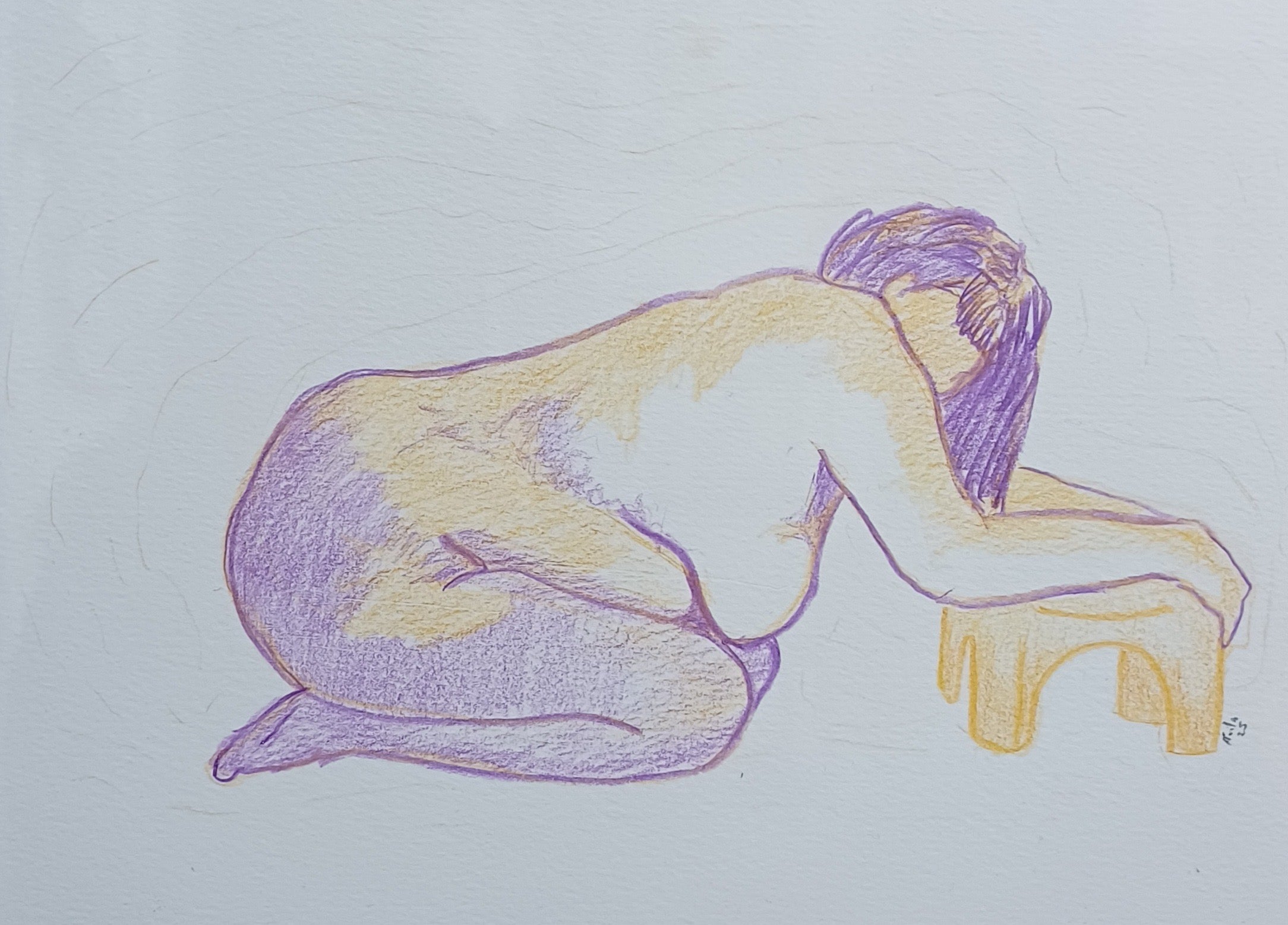 ÁNGEL ÁVILA “MUJER CON BANQUITO" DIBUJO A COLOR
