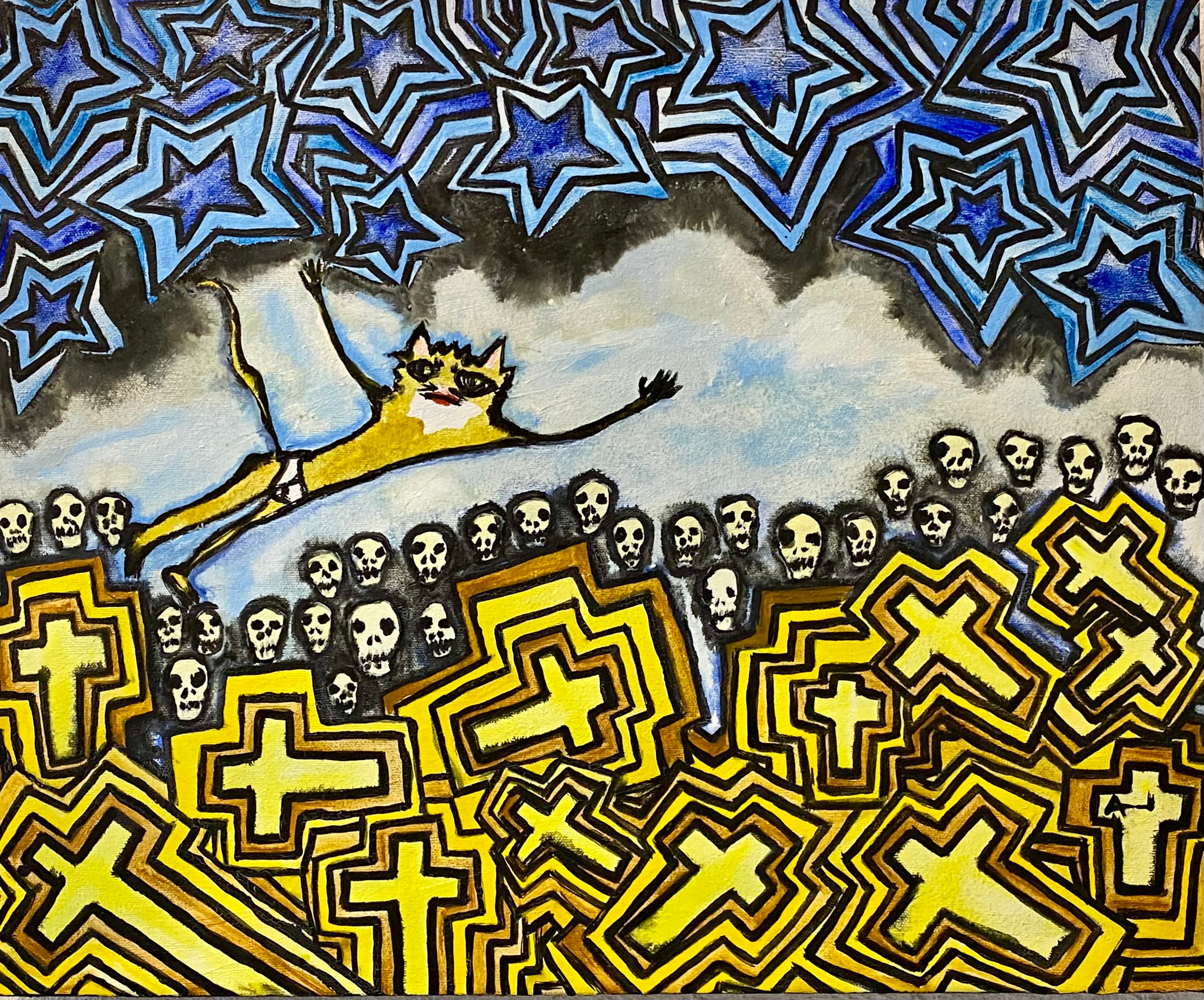 ENRIQUE ARNAUD BLUM "GATO EN TRUSA CON CRUCES, CRÁNEOS Y ESTRELLAS ” PINTURA