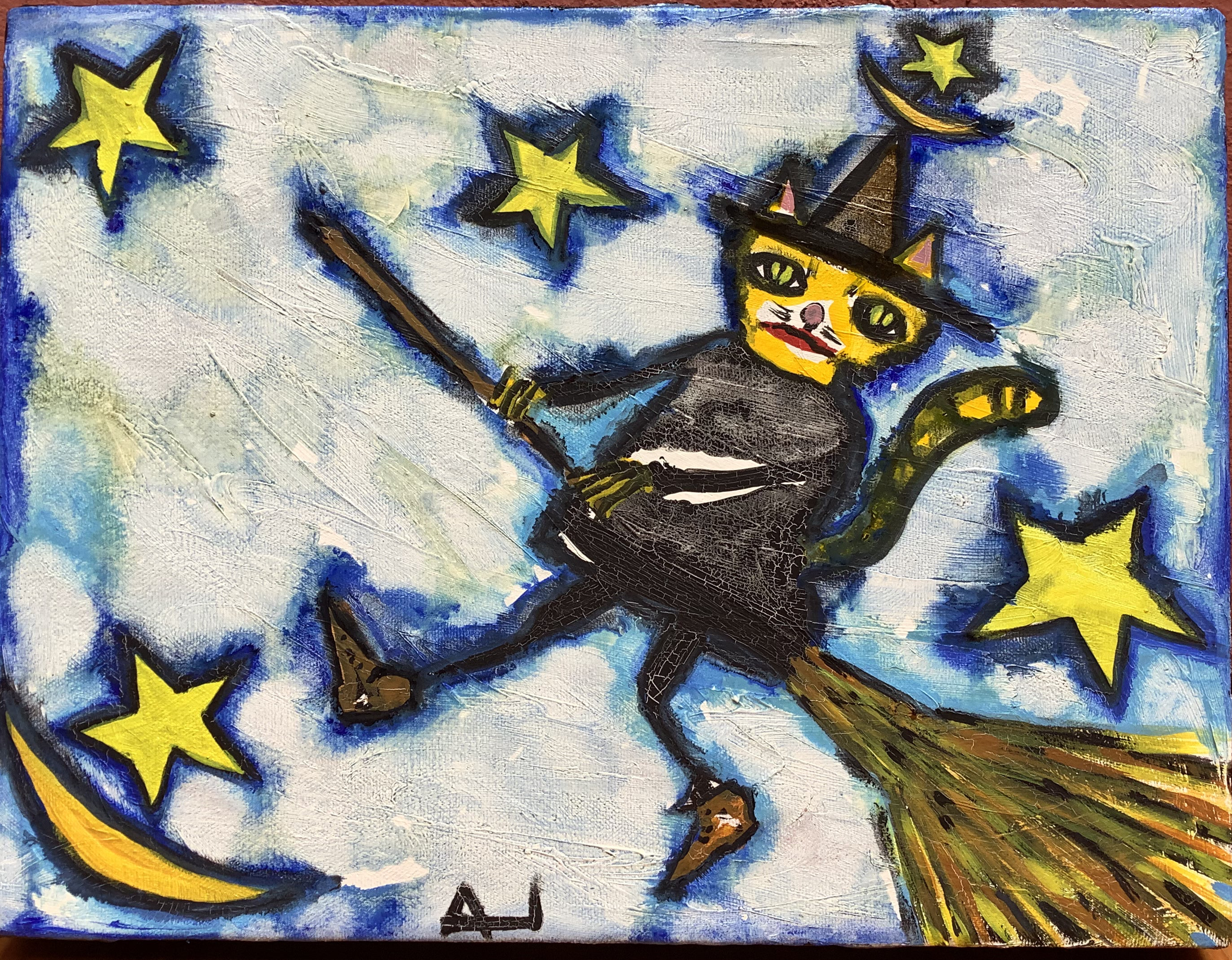 GATO BRUJA EN ESCOBA Y ESTRELLAS AMARILLAS, ÓLEO SOBRE TELA