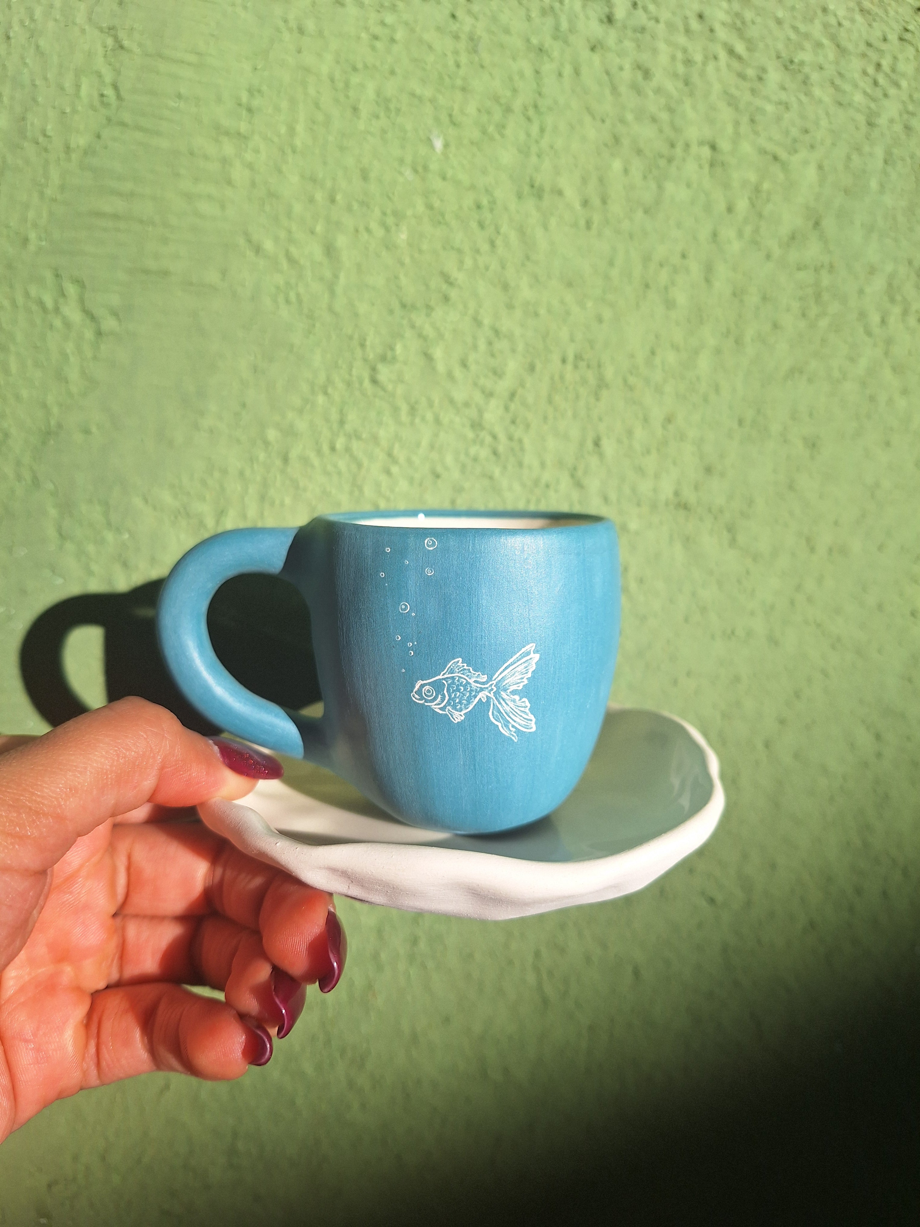 Inspiradas un poco en los corales de tubo del fondo marino, el material cerámico utilizado es una pasta blanca (barro blanco) cocida a temperatura media, con un esmaltado/vidriado interno el cual sirve como una barrera a la filtración, cuenta con un exterior de textura áspera pintada con engobes y esgrafiado a mano por el frente y reverso con temas de la cultura popular mexicana como cráneos y gallos. (la taza de gato solo tiene un lado esgrafiado).