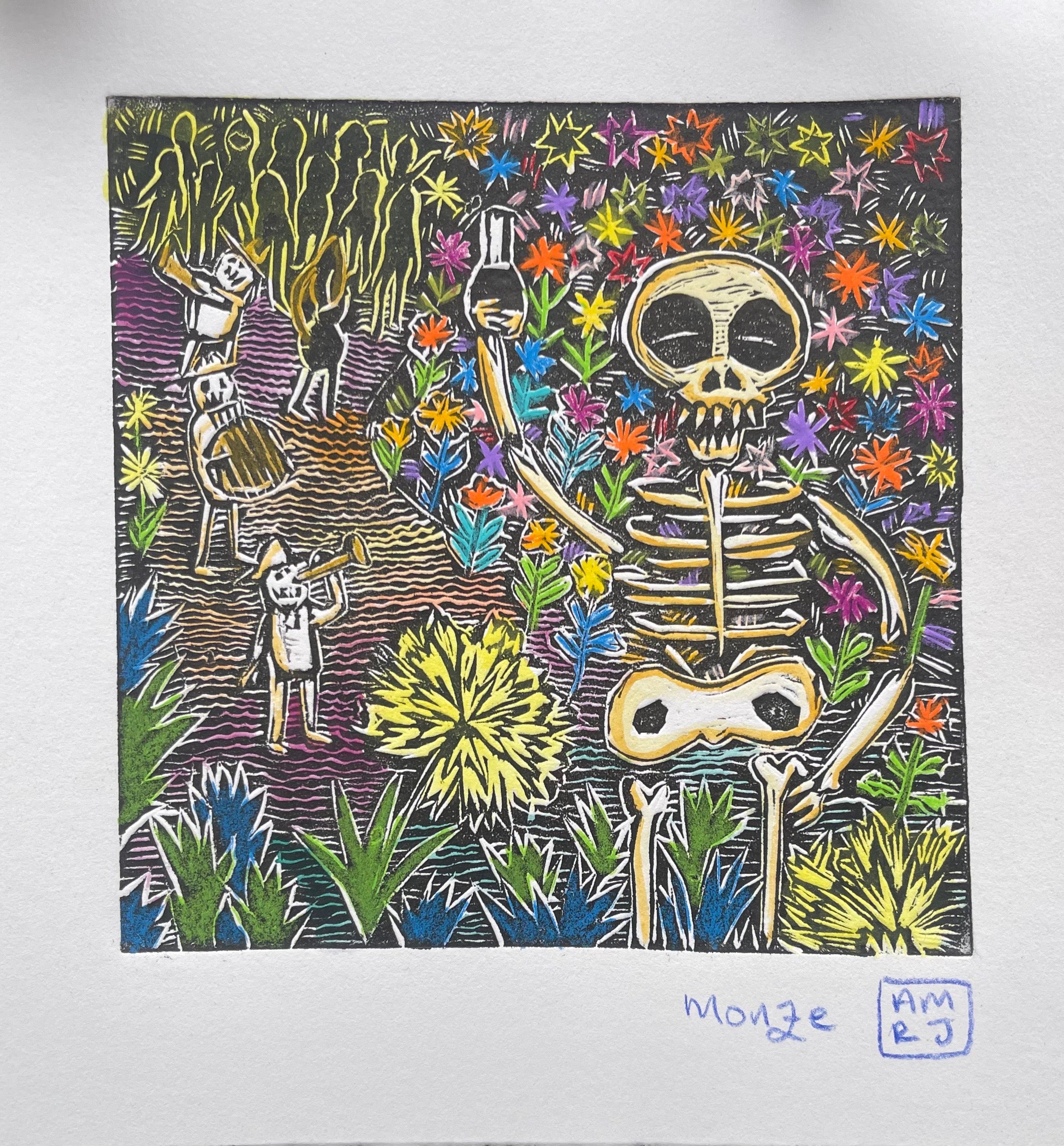 MONZE, CALAVERA MEZCAL Y MUSICOS, LINOGRABADO INTERVENIDO (ACUARELAS Y COLORES)